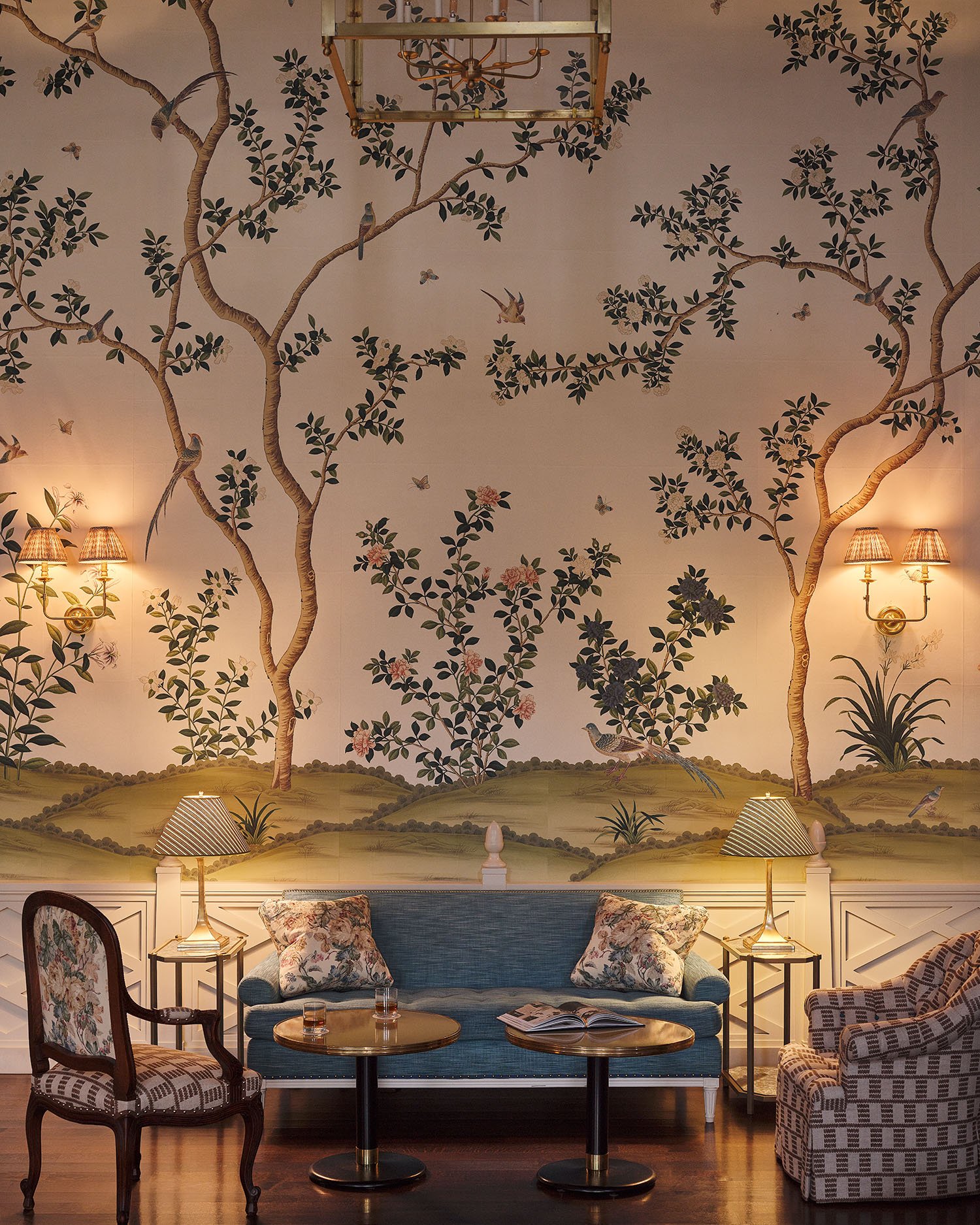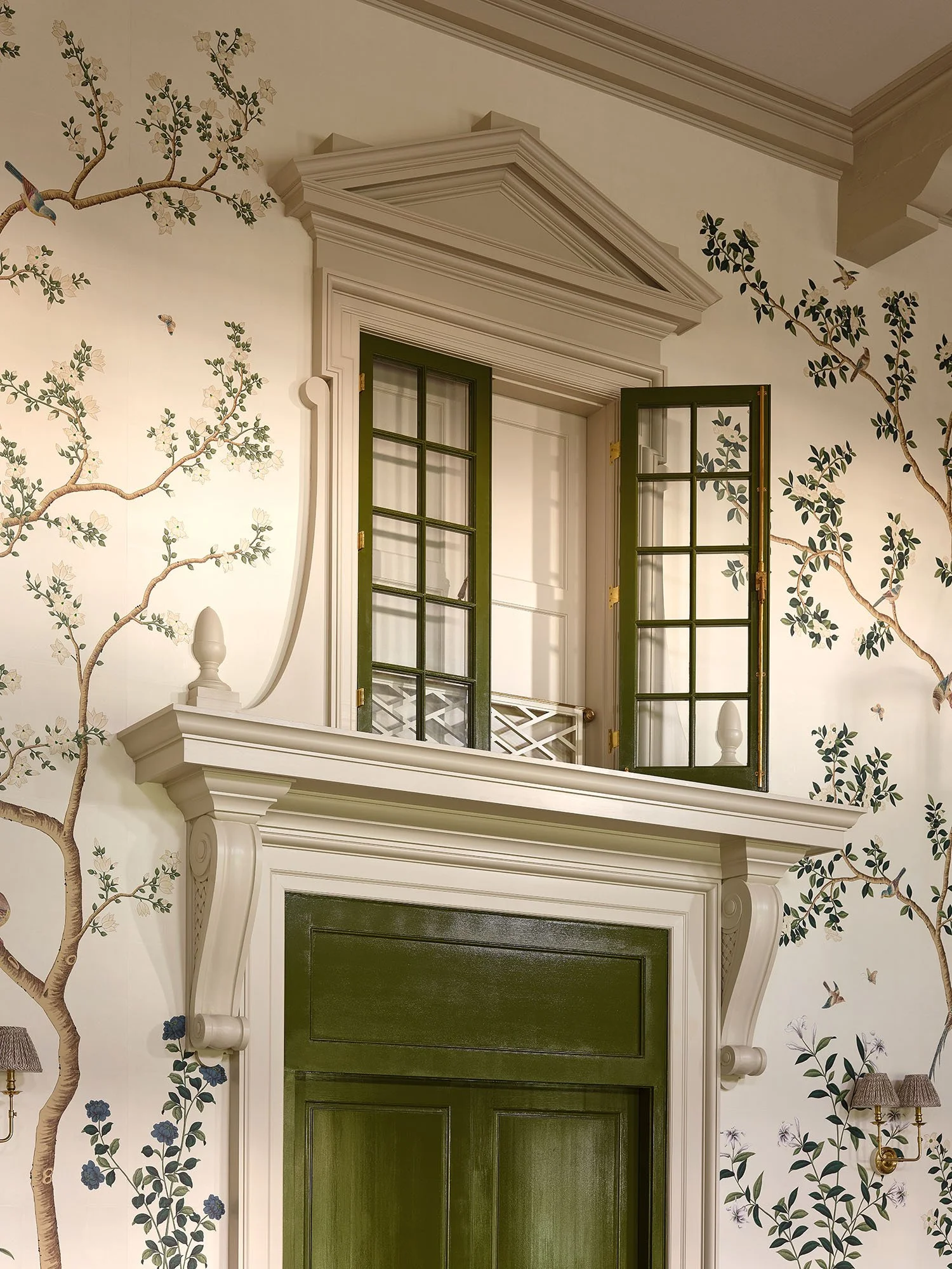 We raised the height of the room, revealing daylight through long-obscured clerestory windows. The new coffered ceiling, punctuated with large brass lanterns mounted to decorative grilles, serves a vastly expanded HVAC system. This enlarged volume also enabled the creation of a new interior French window at the mezzanine level. Framed with paneled shutters and hand-carved brackets, many a bridal bouquet will be flung from this festive addition to the room. The floor level features a new latticework wainscot, refreshed furnishings, and exquisite hand-painted wallpaper by Gracie Studios.